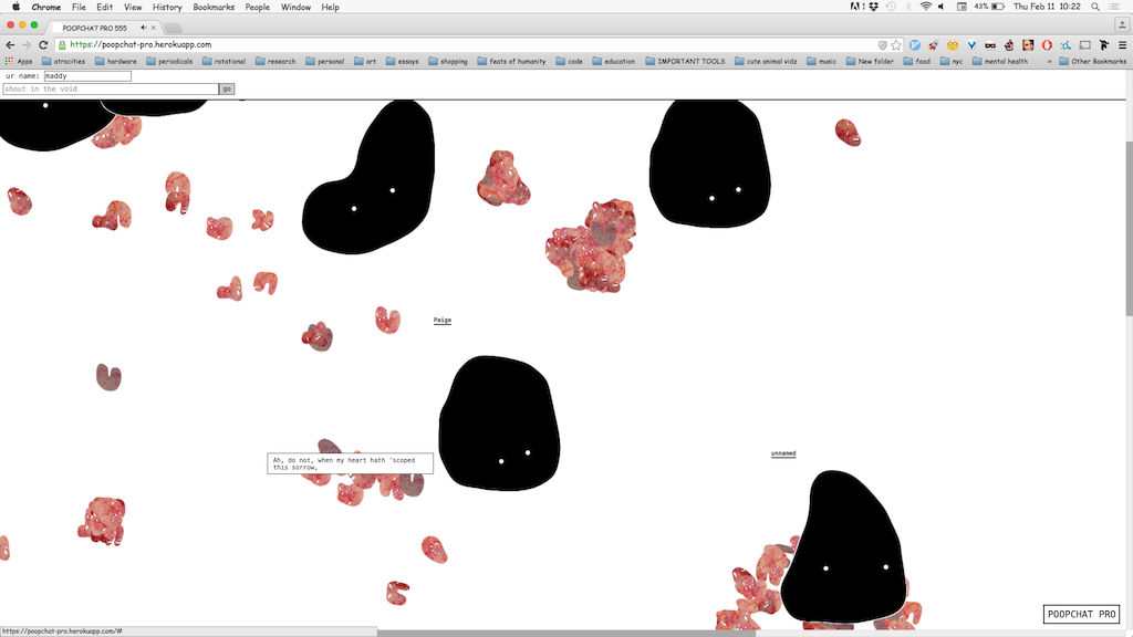 60-212 student, Maddy Varner’s (BFA 2016) POOPCHAT PRO (2015) is a feces-based chatroom in which you are a blob who is literally just talking shit. You can hover over the poops to scry their meaning, and you can drag your blobby body around the board to find exciting new places to poop. Poopchat is nonlinear in nature, ephemeral in practice, and constantly requiring you to flush it all down the drain due to inefficient for-loops.