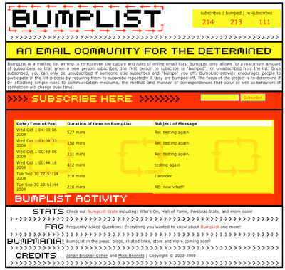 Brucker-Cohen, Jonah. BumpList. 2003. Email list. http://www.bumplist.net. Jonah Brucker-Cohen’s BumpList (2003) is “an email community for the determined”. BumpList “functions like a standard, public listserv, but adds the constraints of limited membership (only 6 people could subscribe at once) and the urgency of forcing people to re-subscribe if they get bumped and want to continue the conversations, discussions, arguments in which they are engaged.”
