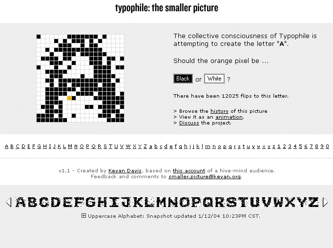 Davis, Kevan. Typophile: The Smaller Picture. 2002. Collaborative pixel art gallery. Typophile is a website wherein visitors are prompted to contribute to the design of a letterform, such as the letter ’A’. Each visitor’s creative options are tightly restricted: their only choice is to decide whether a given pixel, in a 20×20 grid, should be black or white. The letterform’s grid is initialized with random noise. Gradually, as members of the crowd contribute decisions about individual pixels, a collectively designed typeface is produced. https://kevan.org/smaller.cgi.