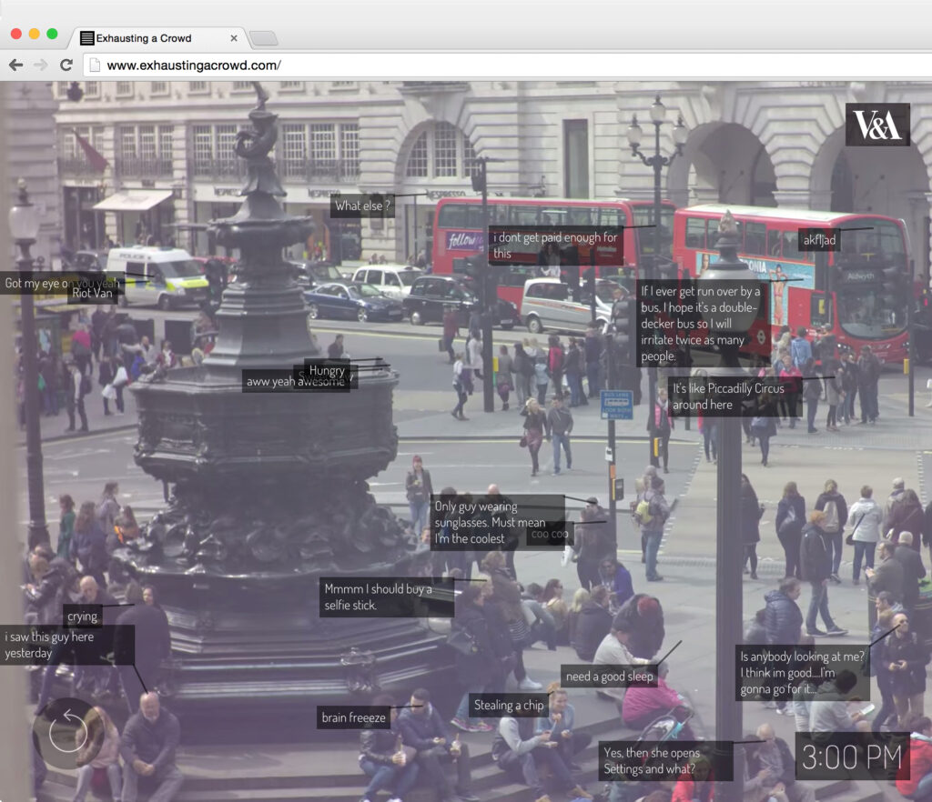 In Exhausting a Crowd (2015), Kyle McDonald invites online audiences to annotate a 12-hour video recording of a public place with their own observations of the scene. Inspired by Georges Perec’s 1974 experimental literary work An Attempt at Exhausting a Place in Paris, McDonald opens up a process of close observation to a broad public, crowdsourcing the discovery and preservation of moments that might otherwise go unnoticed. https://www.exhaustingacrowd.com/london.