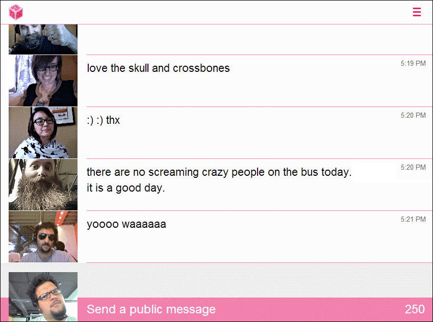 Fong-Adwent, Jen, and Soledad Penadés. Meatspace. 2013. Ephemeral chatroom with animated GIFs. https://chat.meatspac.es/. Meatspace (2013) by Jen Fong-Adwent and Soledad Penadés is an ephemeral conversation space in which participants’ written messages are accompanied by animated GIF loops, instantaneously captured from their webcams.
