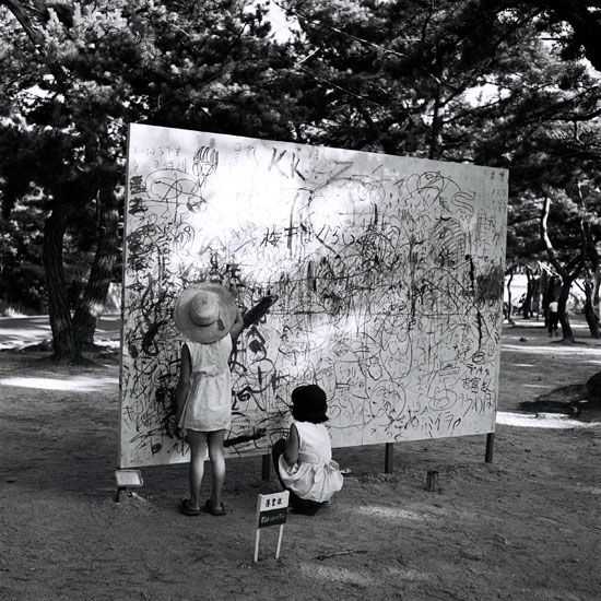 Yoshihara, Jirō. Please Draw Freely. 1956. Paint and marker on wood, 200 x 450 x 3 cm. Please Draw Freely is a large free-standing board on which you are free to draw whatever and however you want. Created by Yoshihara Jirō in 1956, artists of all ages are welcome to draw, scribble, and sketch. Yoshihara was the leader of the Gutai group of radical Japanese artists who wanted to change the world through painting, performance and children’s play.