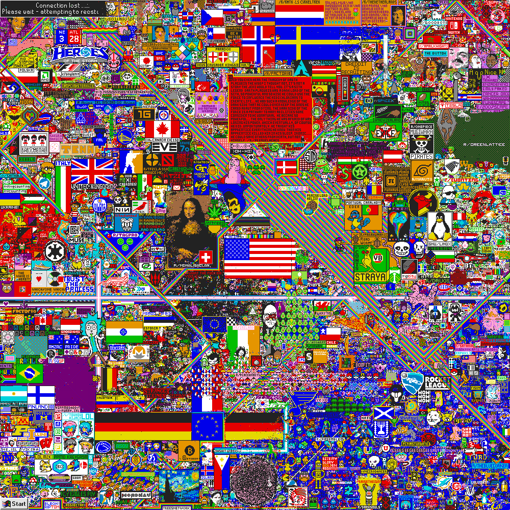 Reddit. /r/place. 2017. Crowdsourced pixel art. https://reddit.com/r/place. R/Place was a 1000×1000 pixel collaborative canvas hosted on Reddit. During a 72-hour period in April 2017, registered users could edit the canvas by selecting the color of a single pixel from a 16-color palette. Because each user could only alter one pixel every five minutes, crowds developed elaborate methods to collectively draw images, write messages, create flags, and overwrite the contributions of others.