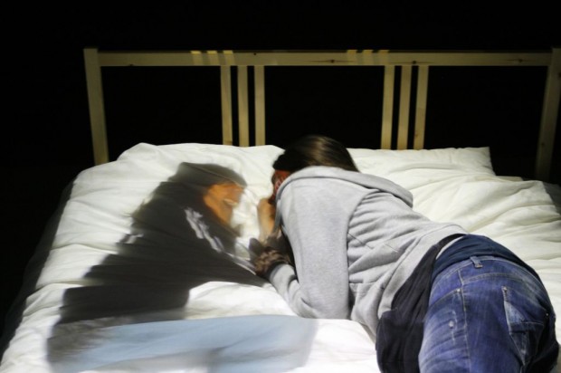 Sermon, Paul. Telematic Dreaming. 1992. Live telematic video installation. http://www.hgb-leipzig.de/~sermon/dream. “a pair of installations that function as customized video-conferencing systems. A double bed is located within both locations, one in a blacked out space and the other in an illuminated space. The bed in the light location has a camera situated directly above it, sending a live video image of the bed, and a person (“A”) lying on it, to a video projector located above the other bed in the blacked out location. The live video image is projected down on to the bed with another person (“B”) on it. A second camera, next to the video projector, sends a live video image of the projection of person “A” with person “B” back to a series of monitors that surround the bed and person “A” in the illuminated location. The telepresent image functions like a mirror that reflects one person within another person’s reflection.”