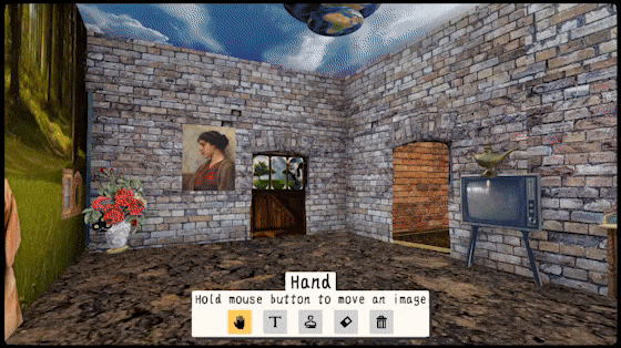 Sokpop Collective. sok-worlds. 2020. Multiplayer collage. https://sokpop.itch.io/sok-worlds. sok-worlds is a game/tool where you make and explore 3d collage worlds. Search a big library of images and add them to your world. Assemble them, cut them out, add text, add some music and create all kinds of cool, weird places to explore!