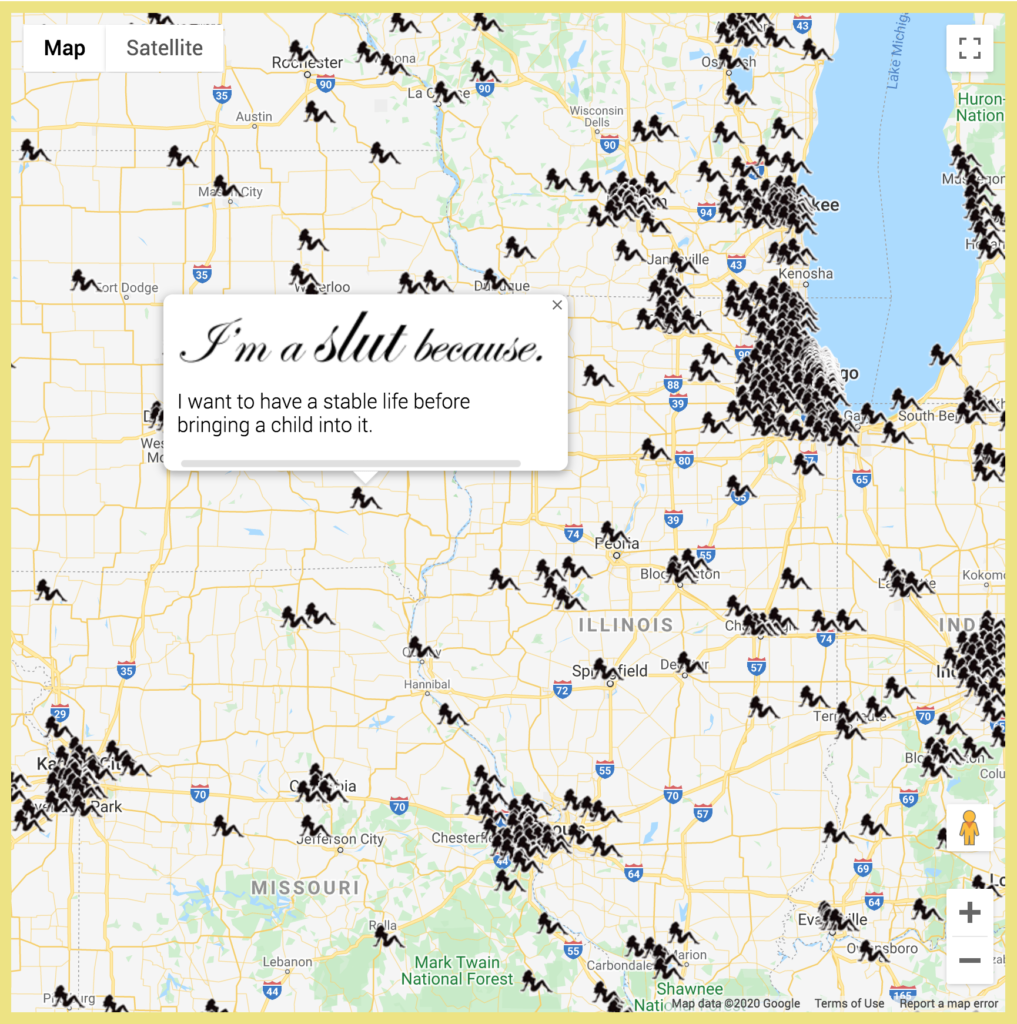 Roopa Vasudevan’s Sluts across America (2012) is a compilation of user-submitted messages advocating for reproductive freedoms, geolocated and displayed on a U.S. map.