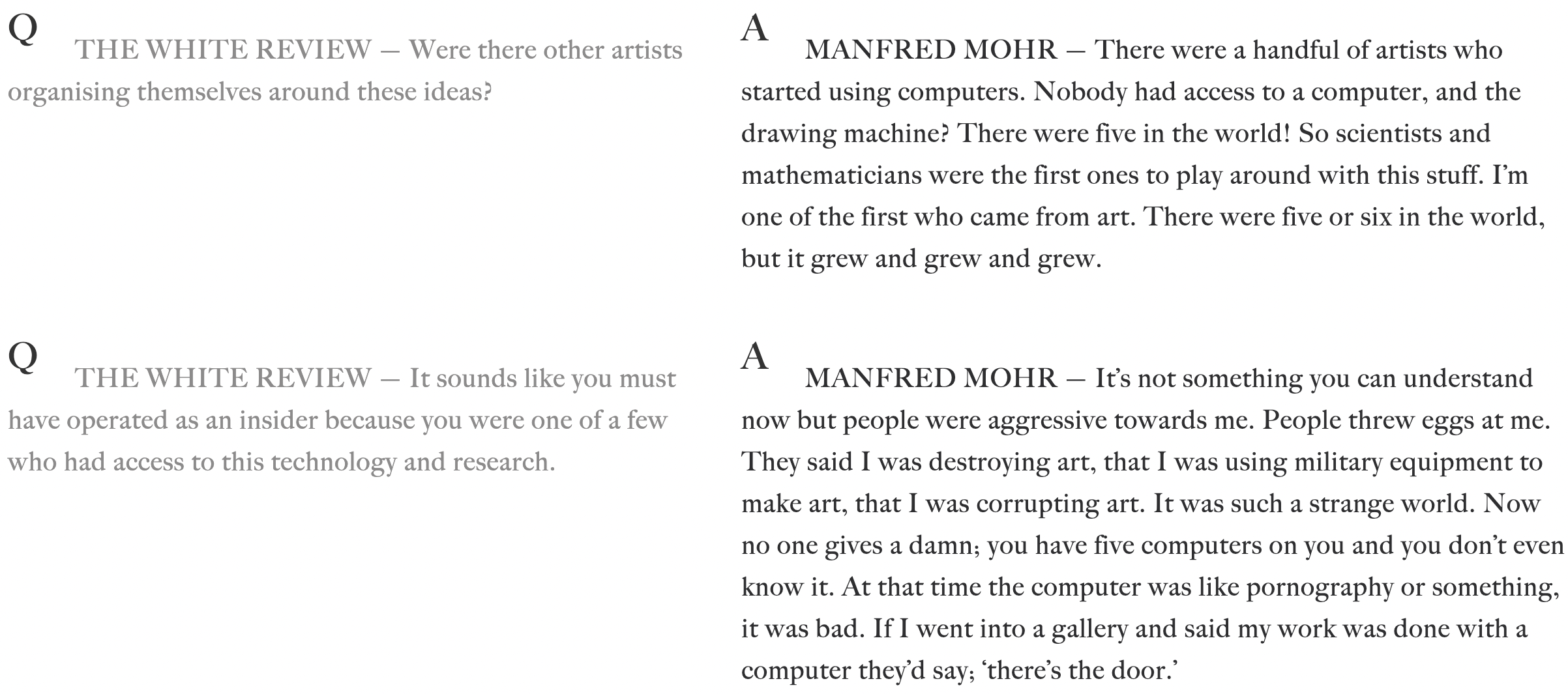 Computer Art is the bastard child of CS and fine art—rejected by both parents. Manfred Mohr (born 1938) is another of the first dozen or so people to make art with a computer; Here’s a brief excerpt from an interview with him.